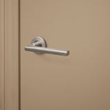 Door de combinatie van het subtiel gebogen handvat en het ronde rozet ontstaat een rustige, verfijnde uitstraling. Deze klink voelt prettig aan en is visueel in balans, ideaal voor wie houdt van eenvoud met oog voor detail. Het geborstelde RVS zorgt daarbij voor een moderne, maar toch warme afwerking.