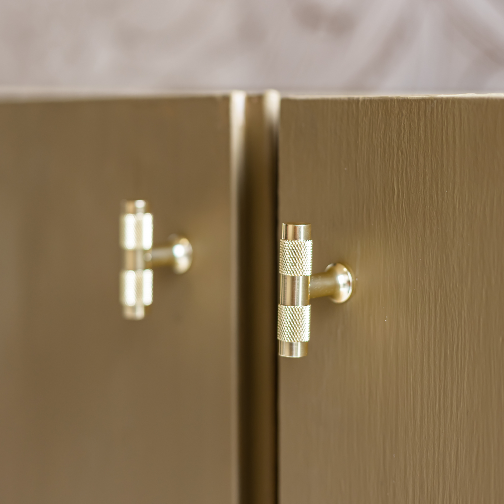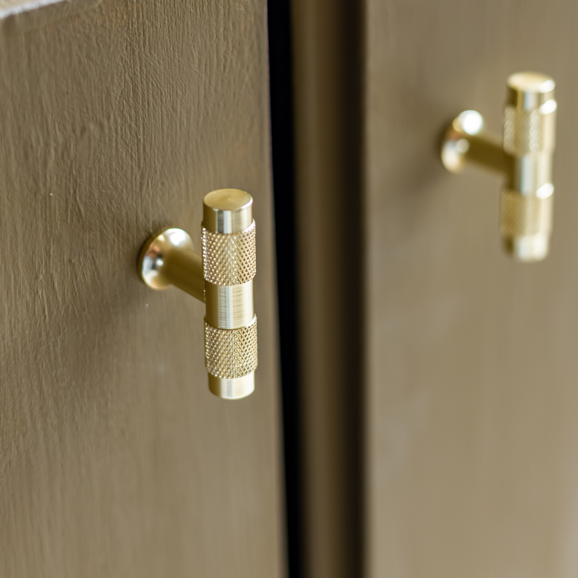 Deze kastknop T-model Ribbel Mat Goud is een toonbeeld van luxe. Het grotere formaat en de opvallende matgouden afwerking maken dit een unieke meubelgreep. Ideaal als blikvanger op keukenkastjes of op je kastenwand.