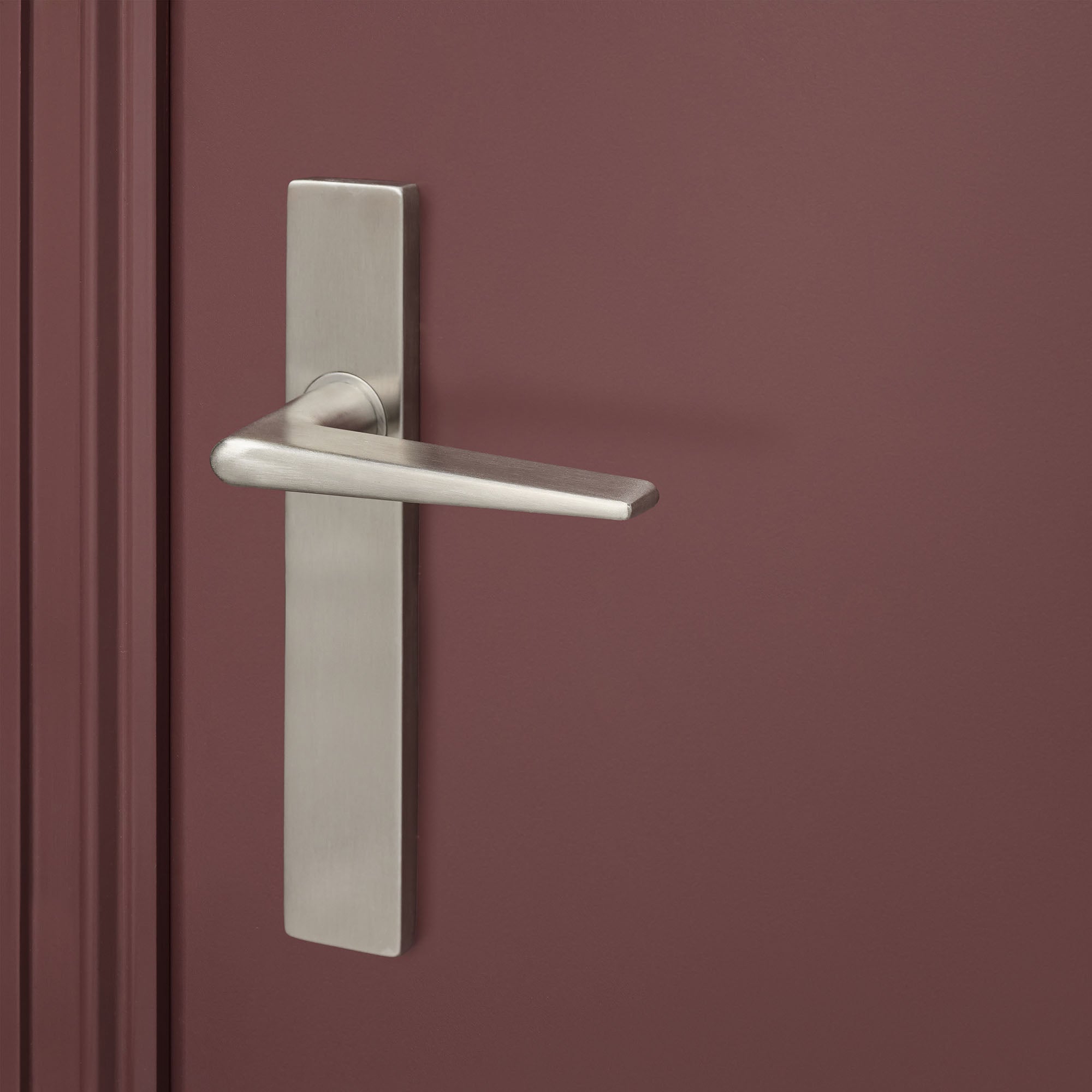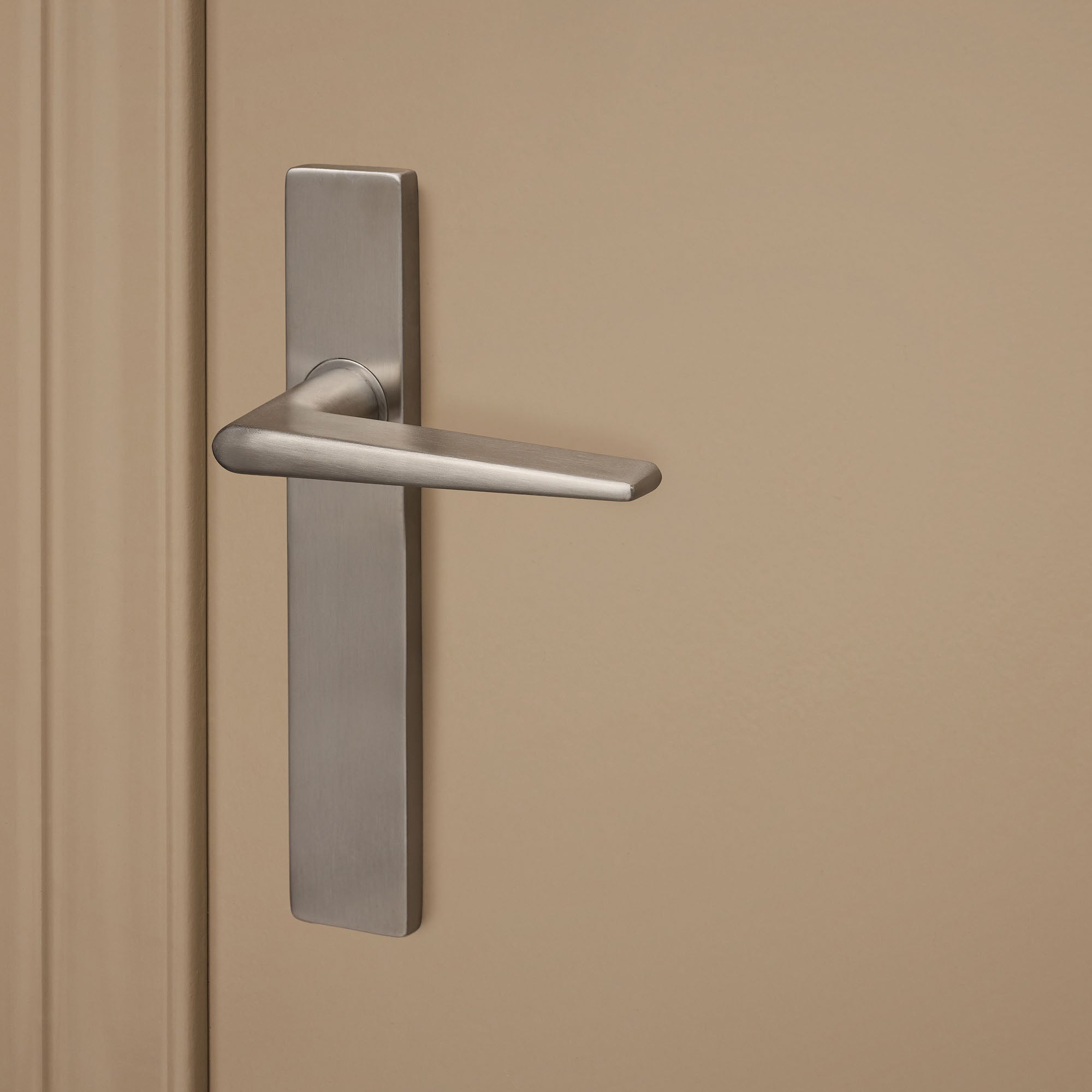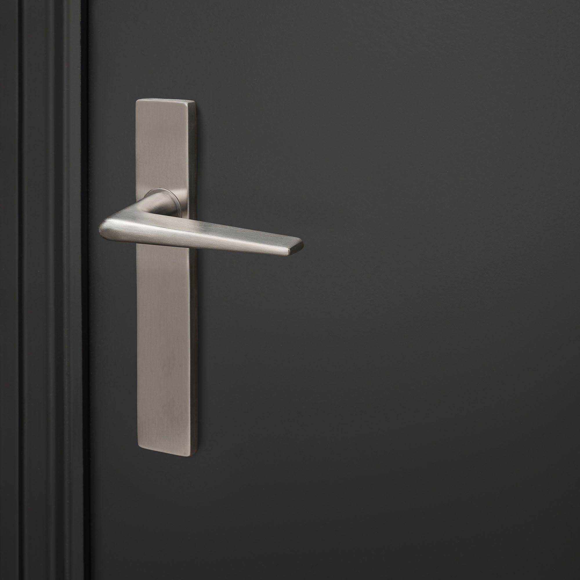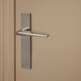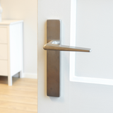 Het rechthoekige schild benadrukt het stoere design en zorgt voor een nette afwerking. De klink loopt taps toe, wat zorgt voor een comfortabele grip en een stevige, solide feel. Ideaal voor dagelijks gebruik in huis of op kantoor.